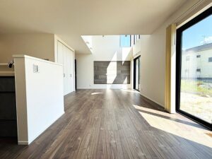 大きな窓から光が差し込み、温かみのある素材感が暮らしを演出します。